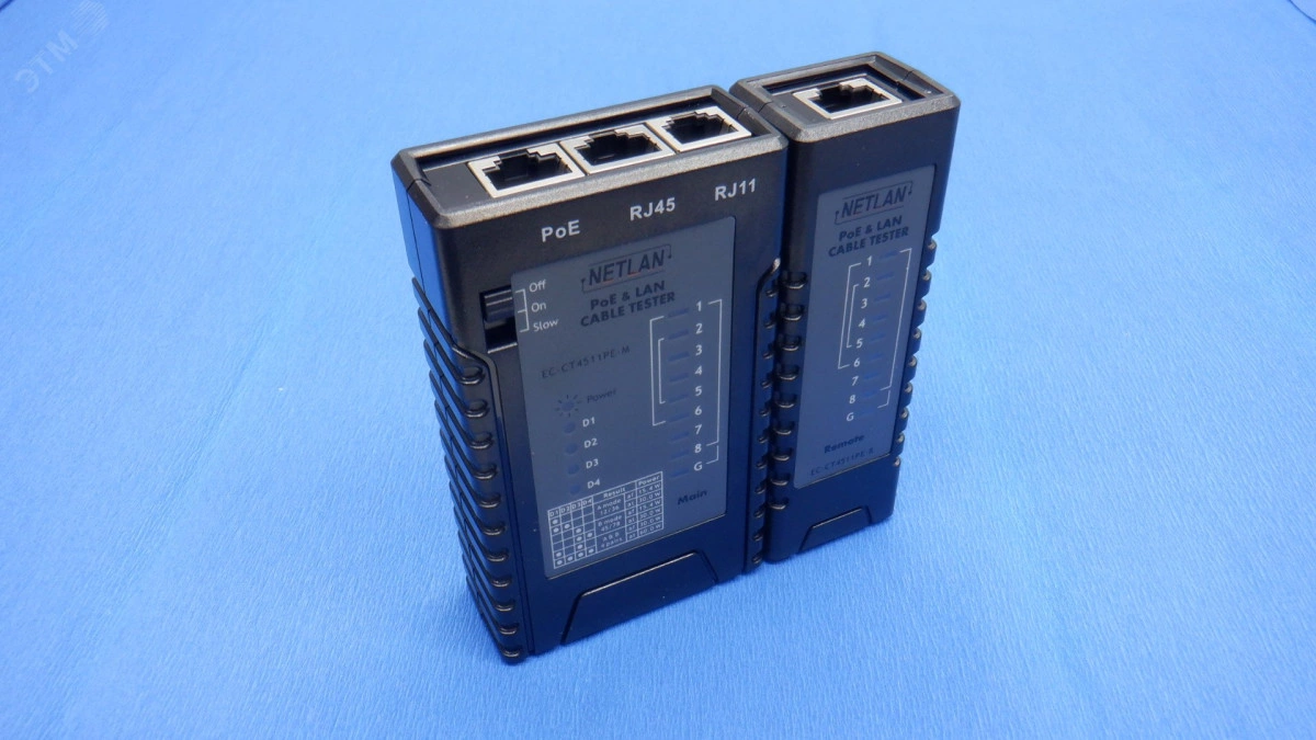 Кабельный тестер EC-CT4511PE предназначен для работы с LAN кабелями, оконцованными разъемами RJ45 и телефонными кабелями с разъёмами Rj11. Тестер способен диагностировать такие ошибки в линии как нарушение схемы разводки проводников, обрыв проводников и короткие замыкания. Так же, тестер способен не только обнаруживать наличие питания в сети (PoE), но и идентифицировать используемый стандарт, 802.3at или 802.3af и вариант передачи (задействованные в передаче питания проводники) - midspan или endspan.