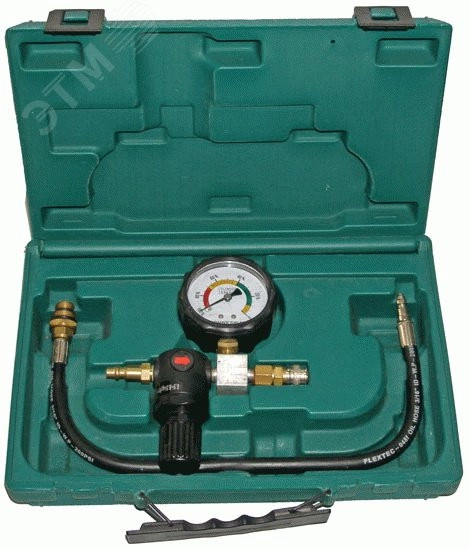 Прибор, с помощью магистрального сжатого воздуха, определяет способность цилиндра бензинового двигателя сохранять герметичность, позволяет обнаруживать дефекты клапанов ГРМ, поршневых колец, стенок цилиндра (гильзы) и прокладок. Инструмент комплектуется шлангом, длиной 450 мм, узлом контроля с манометром и регулятором, адаптерами с резьбой М14 и М18 для подключения к свечному отверстию.