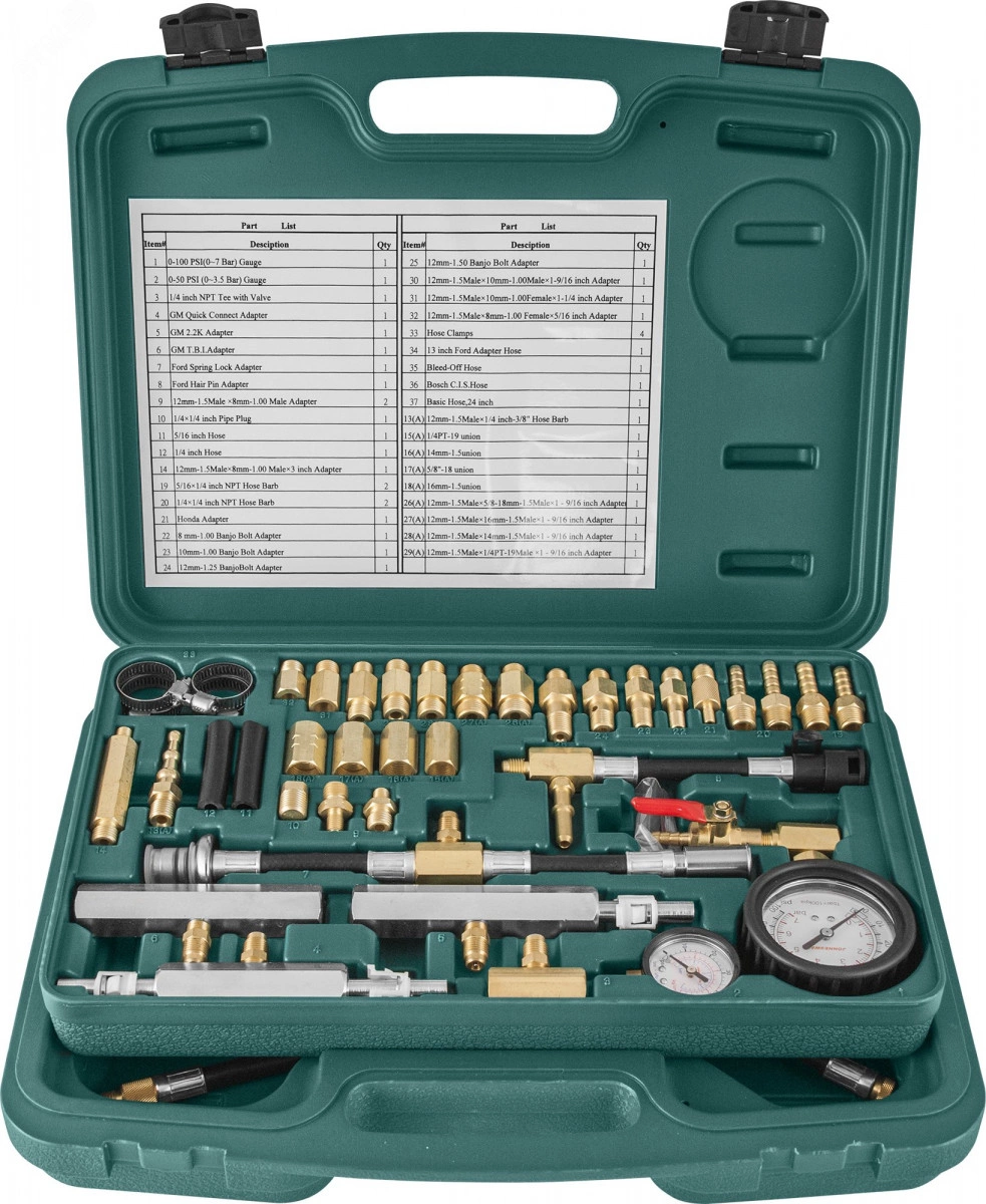 Набор применяется для проведения диагностики топливных систем впрыска бензиновых двигателей и определения неисправностей методом измерения давления в участках магистралей и устройств системы питания. Большая гамма адаптеров позволяет производить измерения давления в топливной системе почти на всех автомобилях отечественного и импортного производства. Инструмент рекомендован к использованию при тестировании систем питания автомобилей - ACURA, HONDA, MAZDA, SUZUKI, TOYOTA, AUDI, MERCEDES, PEUGEOT, PORSCHE, VW, VOLVO и других, оборудованных системами питания типа - BOSCH C.I.S/C.I.S.E и аналогичных по принципу действия, механическими системами впрыска (K-JETRONIC, KE-JETRONIC), системами впрыска с электронным управлением (L, LH, LE-JETRONIC, GM-TBI и др.), ''Моновпрыск'' (MONOTRONIC и др.).