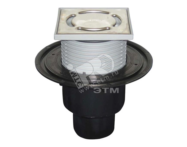 Трап для внутренних помещений DN50/75/110 вертикальный с обжимным фланцем, запахозапирающим устройством Primus, со снимаемыми насадными подрамниками 12 - 70 мм/ 123 х 123 мм и решеткой из нержавеющей стали 115 х 115 мм, с опорными рамами. Строительная защита во время монтажа в комплекте.