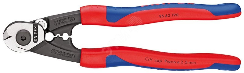 95 62 190 SB Тросорез с двумя профилями для опрессовки наконечников трубок боуденовских тросов и концевых гильз проволочных тросов. удобная работа благодаря оптимальной, вытянутой конструкции и внутренней раскрывающей пружине. винтовой шарнир с регулировкой для точного управления ножами. высокий уровень передачи усилия для экономии сил при работе. Твёрдость режущих кромок примерно 64 HRC. карта самообслуживания/ блистер. - Параметры резания/ рояльная струна (диаметр) - 2,5mm - Параметры режима резки - медный кабель, многопроводный (диаметр) - 7,0mm - Параметры резания проволочного троса (диаметр) - 5,0mm - Параметры резания/проволока средней твёрдости (диаметр) - 4,0mm - AWG - 8