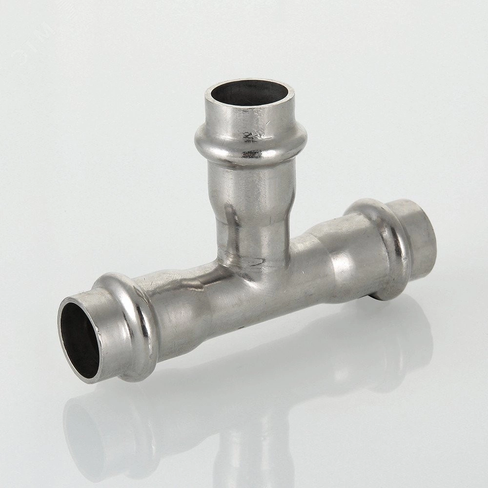 "Трехраструбный пресс-тройник из нержавеющей стали обеспечивает соединение трех тонкостенных стальных труб систем водоснабжения, отопления, иных инженерных и технологических установок с рабочей температурой до 120 градусов и давлением до 16 бар. Изделие изготовлено из стали AISI 304. Материал уплотнительных колец - эластомер EPDM. Отдельно можно приобрести уплотнительные кольца из FPM (витон), в этом случае максимальная рабочая температура увеличивается до 140 градусов.