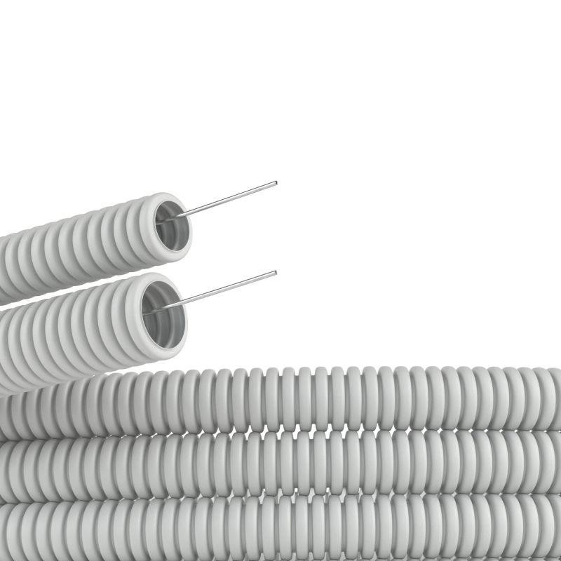 Гибкая гофрированная труба из ПВХ надежно защищает кабель от механических воздействий. Используется для прокладки электрического, компьютерного телефонного кабелей. Труба этого типа прокладывается в стенных штробах, в пустотах фальш-потолков и фальш-стен, в стяжке полов или под фальш-полами. Проволочная протяжка облегчает прокладку кабеля в трубе. Диаметр - 20 мм. Материал – самозатухающий поливинилохлорид (ПВХ). Цвет - серый. Гофрированные трубы из ПВХ легкой серии могут эксплуатироваться при температуре от – 25 °C до + 60 °C. Длина – 50 метров.