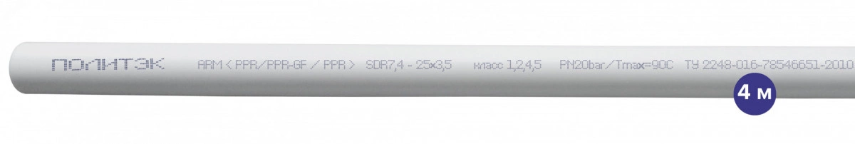 Трубы полипропиленовые армированные стекловолокном  кольцевого сечения из статистического сополимера полипропилена PP-R 80 трехслойные стеклонаполненные (средний слой армирован стекловолокном) (PP-R/PP-R GF/ PP-R) т. м. `ПОЛИТЭК` номинальным наружным диаметром от 20 до 75 мм предназначены для подачи воды с температурой до 70 градусов (допускается кратковременное увеличение температуры до 95 градусов).