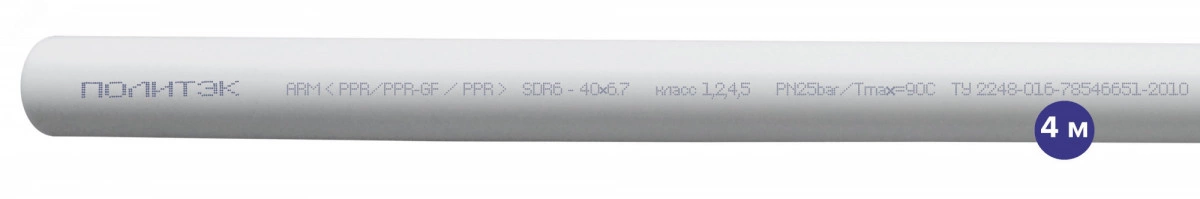 Трубы полипропиленовые армированные стекловолокном  кольцевого сечения из статистического сополимера полипропилена PP-R 80 трехслойные стеклонаполненные (средний слой армирован стекловолокном) (PP-R/PP-R GF/ PP-R) т. м. `ПОЛИТЭК` номинальным наружным диаметром от 20 до 75 мм предназначены для подачи воды с температурой до 70 градусов (допускается кратковременное увеличение температуры до 95 градусов).