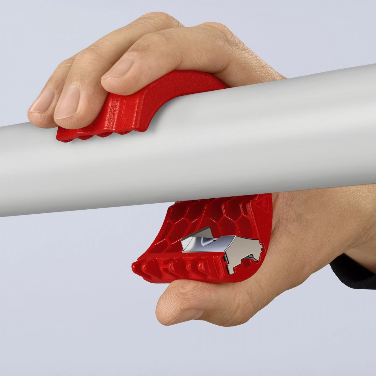 90 22 10 BK KNIPEX BiX Умный труборез - режет трубы без стружки и удобно лежит в руке. Может быстро разрезать сливные трубы из термостойкого пластика и электрические кабели. Может использоваться для резки уплотнительных втулок в процессе окончательной сборки – близко к стене и в соответствии со стандартами. Режет неармированные пластиковые трубы диаметром от 20 до 50 мм с толщиной стенки до 2,4 мм. Режет мягкие пластиковые трубы и трубы со вспененным сердечником от 20 до 50 мм с толщиной стенки до 3,5 мм. Режет уплотнительные втулки на расстоянии прибл. 2-3 мм от стены. Режет трубы быстро, чисто и без стружки. Блок поворотного лезвия для резки пластиковых труб (лезвие по центру) или уплотнительных втулок (лезвие на внешней стороне). Наличие механизма блокировки для безопасной транспортировки. Внутри инструмента имеется отсек с двумя запасными лезвиями. - - 20?–?50mm - - 20?–?50mm