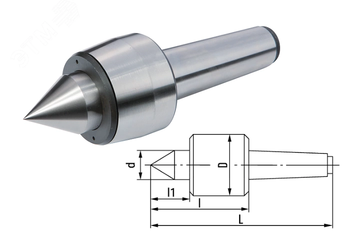 Вращающийся центр предназначен для токарных станков. Вращающийся центр надежно фиксирует заготовку с торца для устранения упругих деформаций, которые возникают при обработке длинных заготовок. При использовании вращающегося центра увеличивается КПД и устраняется нагрев в месте контакта.