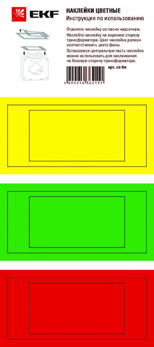 Цветные наклейки предназначены для цветовой маркировки по фазам трансформаторов тока ТТЕ. Согласно ПУЭ, п.1.1.30, при переменном трехфазном токе шины фазы А должны иметь желтый цвет, фазы В — зеленый цвет, фазы С — красный цвет. В комплект наклеек входит инструкция по применению, три цветных рамки (жёлтая, зеленая, красная) для маркировки верхней части трансформатора тока вокруг пломбировочной крышки и три цветных полоски из центральной части рамки, которые можно наклеить на боковую поверхность трансформатора тока или шину.