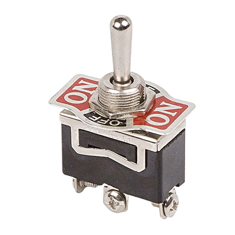 Тумблер 250V 15А (3c) ON-ON однополюсный предназначен для коммутации электрических цепей переменного тока напряжением до 250В. Такая разновидность переключателей применяется на лицевых панелях в качестве комплектующих изделий различного электрооборудования (в измерительных приборах, блоках питания, электроустановках на различных производствах, легковых и грузовых автомобилях, поездах и многих других местах). Отличительной особенностью тумблера является перекидной переключатель, принцип действия которого основан на его перемещении в одну из позиций. Для переключения в нужное положение требуется приложить некоторые усилия. Монтаж осуществляется без применения винтов на плоских панелях толщиной от 0.8мм до 4мм. Подключение контактов осуществляется с помощью винтов.