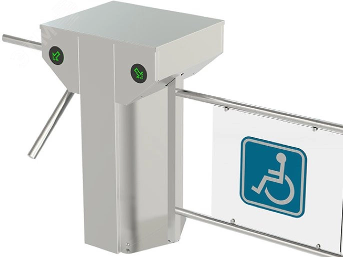 Турникет-калитка для МГН моторизованная. Корпус и преграды - нержавеющая сталь AISI 304. Оснащена платой управления и светодиодными указателями прохода и направления. Сервопозиционный электропривод створки с определением препятствий и автоматической разблокировкой при отключении электроэнергии. Створка 900 мм с информационной вставкой. Комбинированная с турникетом-триподом моторизованным высокоинтенсивным STILE 500 с автоматической системой антипаники. Встроенный блок питания.