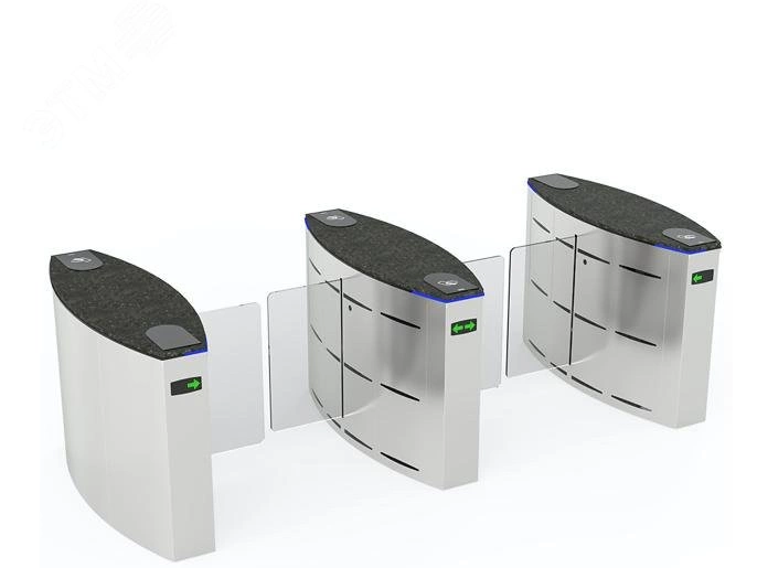 Комплект раздвижного турникета, состоящий из двух боковых и одного центрального модулей. Оснащен платой управления и светодиодными указателями прохода и направления. Корпус - нержавеющая сталь AISI 304. Сервопозиционный электропривод створки с определением препятствий и автоматической разблокировкой при отключении электроэнергии. Створка из 10 мм закаленного стекла. Ширина прохода 2 х 900 мм. Высота створок 900 мм. Время открытия - 1.6 сек. Встроенный блок питания. Возможно неограниченное увеличение количества проходов добавлением центральных модулей 001SG90SC.