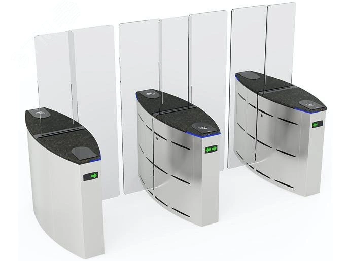 Комплект раздвижного турникета, состоящий из двух боковых и одного центрального модулей. Оснащен платой управления и светодиодными указателями прохода и направления. Корпус - нержавеющая сталь AISI 304. Сервопозиционный электропривод створки с определением препятствий и автоматической разблокировкой при отключении электроэнергии. Створка из 10 мм закаленного стекла. Ширина прохода 2 х 900 мм. Высота створок 2000 мм. Время открытия - 1.8 сек. Встроенный блок питания. Возможно неограниченное увеличение количества проходов добавлением центральных модулей 001SG90TC.