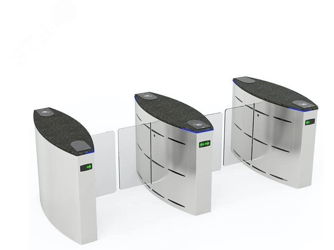 Комплект раздвижного турникета, состоящий из двух боковых и одного комбинированного центрального модулей. Оснащен платой управления и светодиодными указателями прохода и направления. Корпус - нержавеющая сталь. Сервопозиционный электропривод створки с определением препятствий и автоматической разблокировкой при отключении электроэнергии. Створка из 10 мм закаленного стекла. Ширина прохода 550 + 900 мм. Высота створок 900 мм. Время открытия - 1.3 сек. 1Возможно неограниченное увеличение количества проходов добавлением центральных модулей 001SG55SC или 001SG90SC.