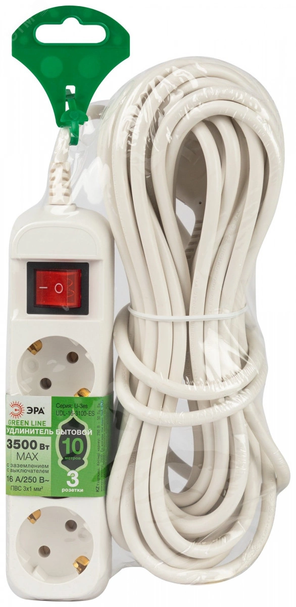 Полное описание: Удлинитель электрический 3 розетки с заземлением с выключателем 10м ПВС 3x1мм2 UDL-16-3100-ES Greenline ЭРА