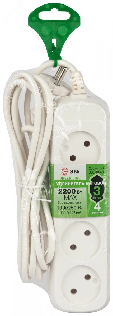 Удлинитель электрический 4 розетки без заземления 3м ПВС 2x0.75мм2 UDL-10-430 Greenline ЭРА