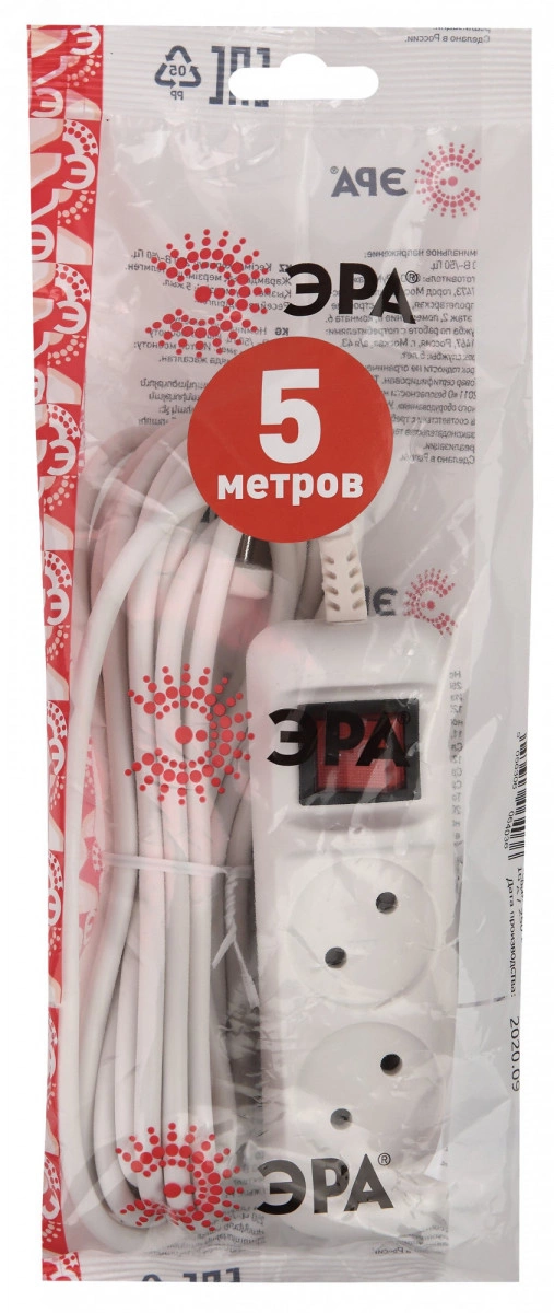 Удлинитель электрический Эра U-2s-3m-2x1 без заземления, с выключателем, ПВС, 2x1мм2, 2 розетки, 5м. Рассчитан на максимальную мощность 10А/2200 Вт. Удлинитель Эра станет Вашим надежным помощником, если Ваши любимые электроприборы находятся далеко от розеток. Провод в удлинителях Эра сделан из 100% меди, что делает его абсолютно пожаробезопасным. Корпус выполнен из ударопрочного и негорючего пластика (полипропилен). Модель удлинителя на 10А позволяет подключить бытовые приборы общей нагрузкой до 2200Вт. Дизайн удлинителя разработан в России командой Эра Style.