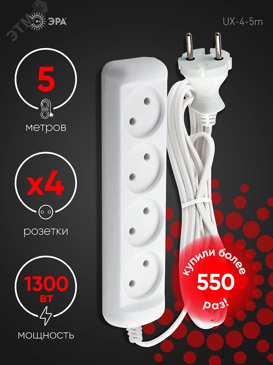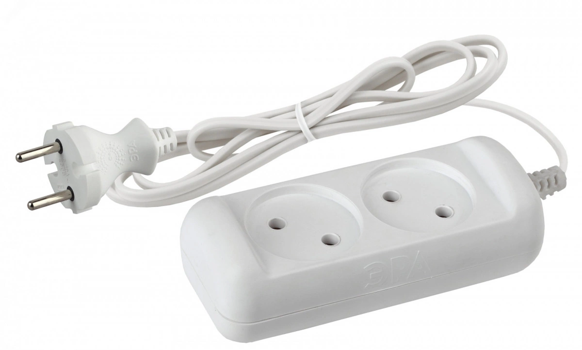 Компактный бытовой удлинитель ЭРА UX-2-5m на 2 розетки, без заземления. Рассчитан на одновременное подключение к розетке до двух маломощных электроприборов, максимальная нагрузка - 6 A/ 1300 Вт. Длина шнура - 5 метров. Надёжный двухжильный провод ШВВП. Корпус изготовлен из прочного негорючего полипропилена с защищающими от возгорания антипиренами. Закруглённые углы, брендирование на вилке и корпусе, базовый белый цвет- этот удлинитель отличается аккуратным приятным дизайном.
