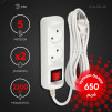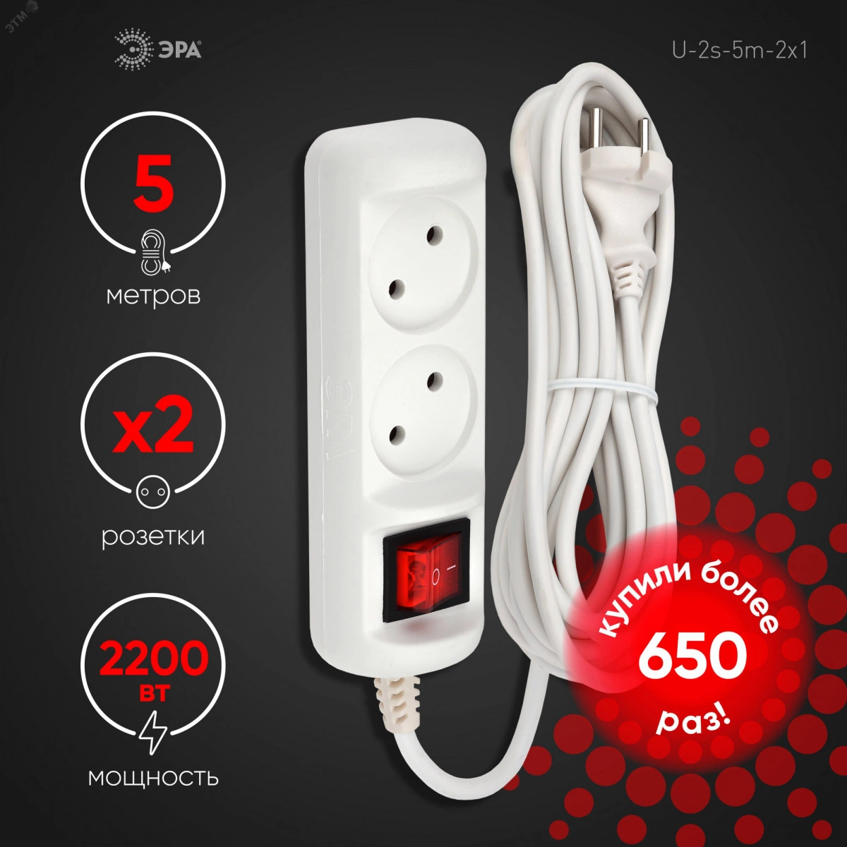 Бытовой удлинитель ЭРА UX-4-5m на 4 розетки, без заземления, с удлинённым проводом ШВВП 5 метров. Рассчитан для подключения простых бытовых приборов стандартной мощности. Максимальная нагрузка - 6 A/ 1300 Вт. Базовый белый цвет, аккуратный дизайн с закруглёнными углами. Для комфорта и безопасности гнёзда слегка ''утоплены'' в корпус. Изготовлен из надёжного полипропилена со специальными антипиренами, препятствующими горению.