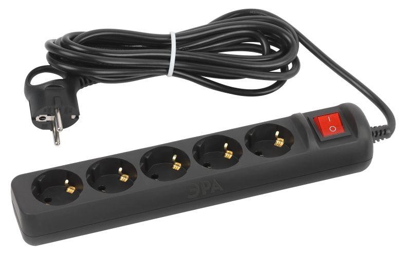 Удлинитель электрический UX-5es-5m-B с заземлением с выключателем 5 розеток 5м ПВС 3х0.75мм2 10А черн. Эра Б0057732