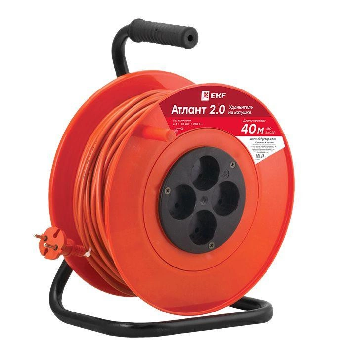 Полное описание: Удлинитель на катушке 4х40м без заземл. 6А IP20 Атлант 2.0 1.3кВт ПВС 2х0.75 PROxima EKF UKA02-06-275-4-40