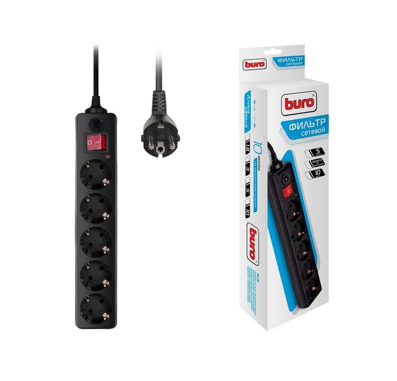 Удлинитель с сетевым фильтром 5х3м с заземл. 10А IP20 500SH-3-B CCA 2200Вт черн. BURO 992293