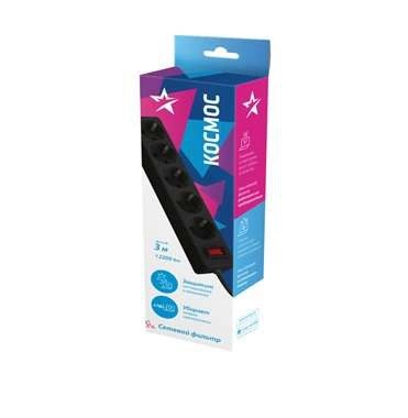 Полное описание: Удлинитель с сетевым фильтром 5х3м с заземл. 10А IP20 2.2кВт 3х0.75 индикатор сети черн. Космос FKsm3m-5g(B)