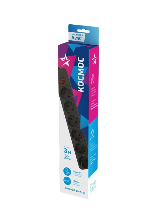 Полное описание: Удлинитель с сетевым фильтром 6х3м с заземл. 16А IP20 3.5кВт с предохранителем 3х1 индикатор сети черн. КОСМОС FKsm3m-6g(B)16A