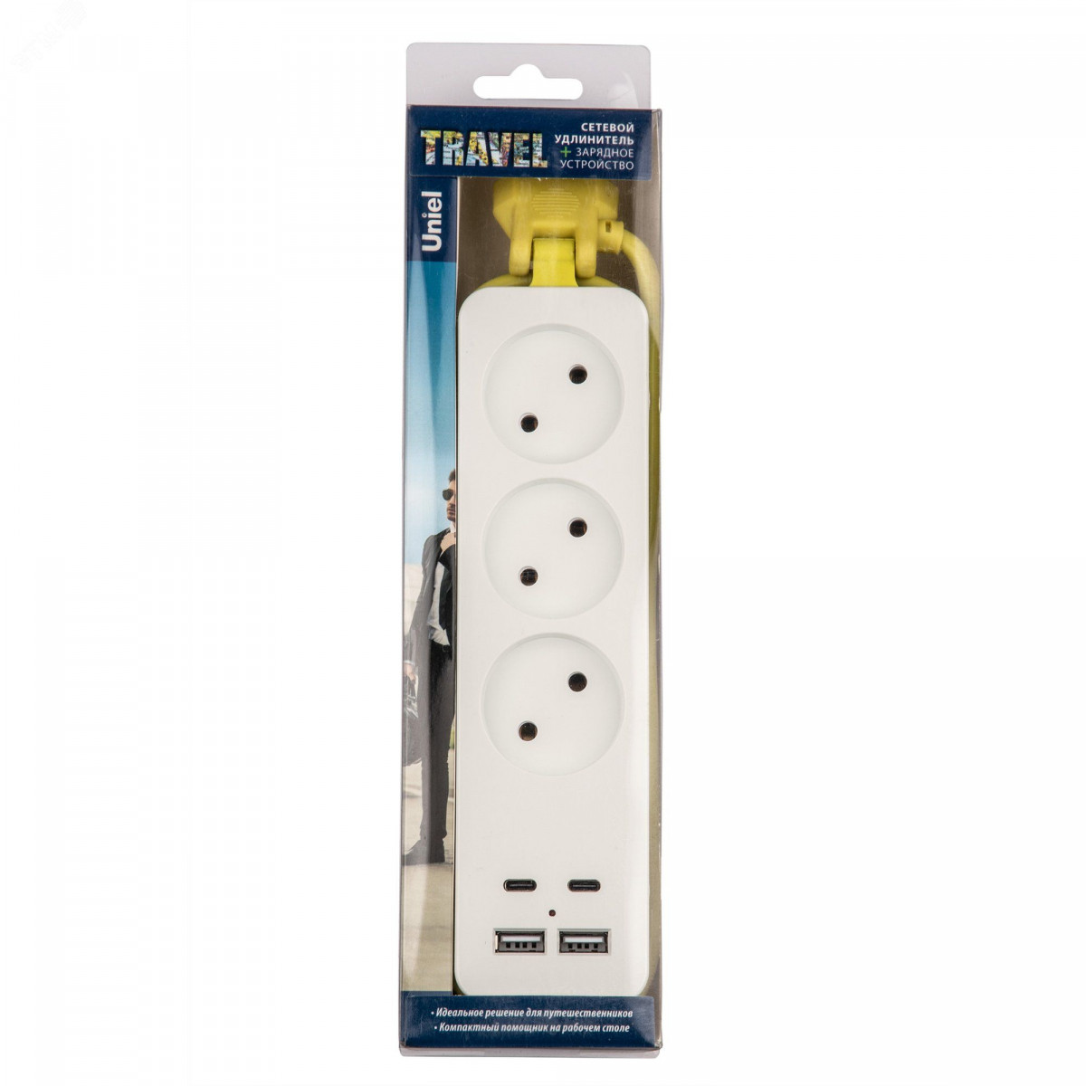 Удлинитель серии Travel шнур 1,8м 3 гнездa 10A без заземления 2USB+2TYPE C 3,1A Белый с салатовым ТМ Uniel S-CT3-1,8UC WHITE/GREEN