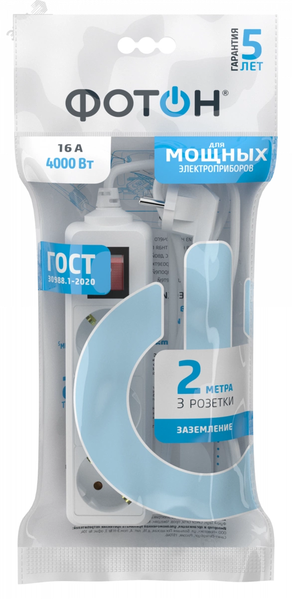 Удлинитель сетевой ''ФОТОН'' 16-23ES с заземлением предназначен для подключения электроприборов суммарной мощностью до 4000Вт. Оснащен выключателем, позволяющим обесточить все разъемы одним нажатием кнопки. Снабжены защитными шторками, прикрывающими контакты, для обеспечения дополнительной безопасности. Колодка с 3 розетками и длиной провода 2 метра. Полностью соответствует нормам ГОСТ и ЕАС. Предоставляется безусловная гарантия 5 лет.