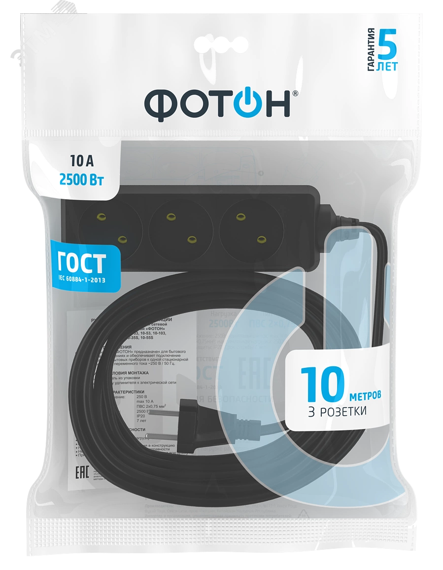 Контактная группа. латунь. Корпус. черный термоустойчивый ударопрочный пластик. Количество розеток. 3. Длина провода. 10 м. Тип провода. 2х0,75 мм2. Номинальный ток. max 10 А. Мощность. 2500 Вт. Безусловная гарантия 5 лет. Обмен без чеков и гарантийных талонов, нужно обратиться по телефону горячей линии производителя.