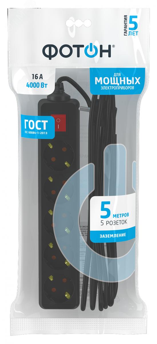 Удлинитель сетевой ''ФОТОН'' 16-55ES с заземлением предназначен для подключения электроприборов суммарной мощностью до 4000Вт. Оснащен выключателем, позволяющим обесточить все разъемы одним нажатием кнопки. Снабжены защитными шторками, прикрывающими контакты, для обеспечения дополнительной безопасности. Колодка с 5 розетками и длиной провода 5 метров. Полностью соответствует нормам ГОСТ и ЕАС. Предоставляется безусловная гарантия 5 лет.