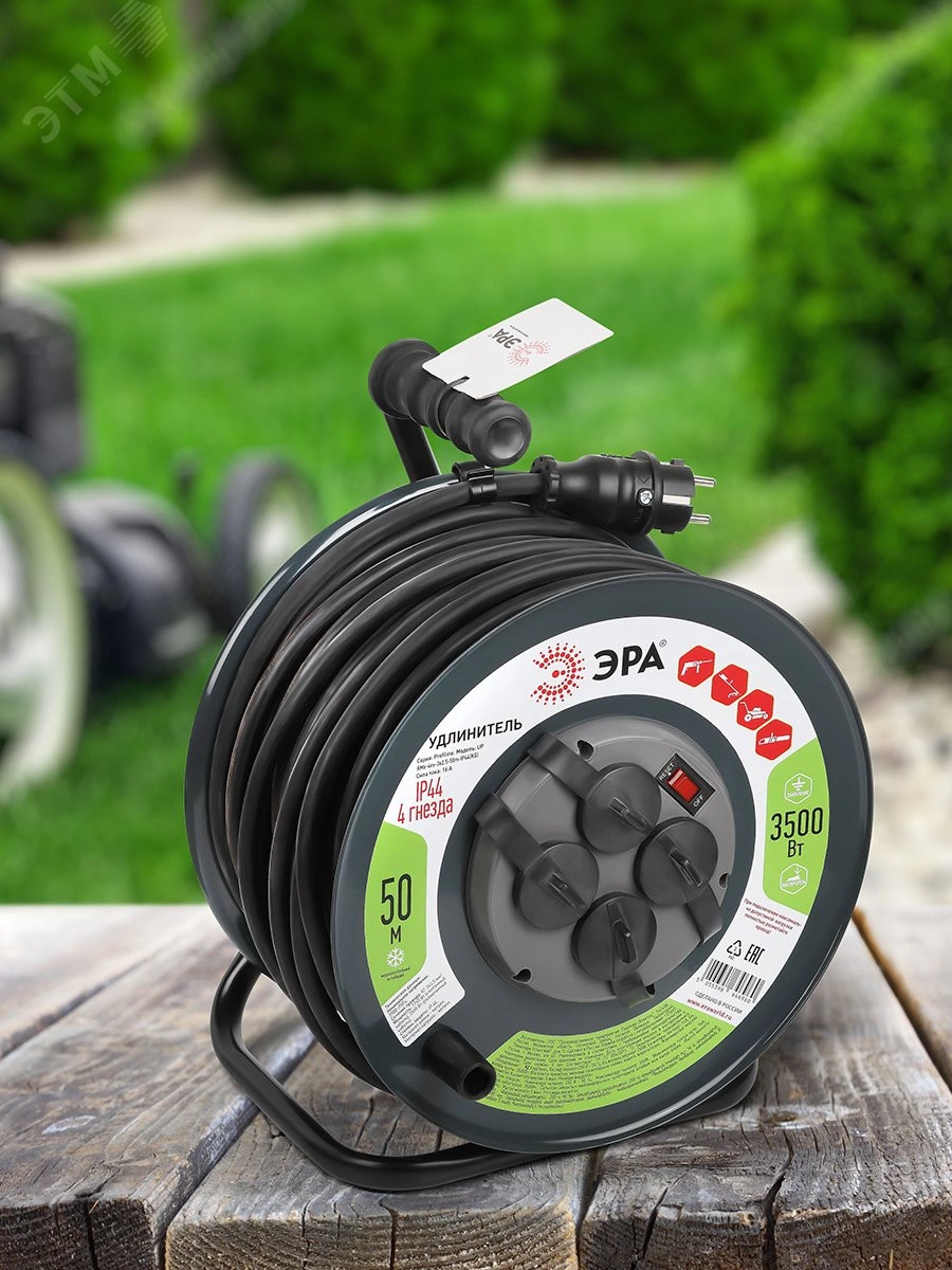 Удлинитель ЭРА RMx-4es-3x2.5-40m-IP44 на металлической катушке, с заземлением, с выключателем, ПВС 3х2,5мм2, 4 гнезда, IP44, мощность 16А / 3500Вт, провод 40м. Используется для работы на строительных площадках или дачных участках. Удобен при работе с приборами находящимися удаленно от стационарной розетки. Например, газонокосилки, электрические, пилы, триммеры или электродрели. Провод в удлинителях Эра сделан из 100% меди, что делает его абсолютно пожаробезопасным. Рама удлинителя сделана из высокопрочной стали.