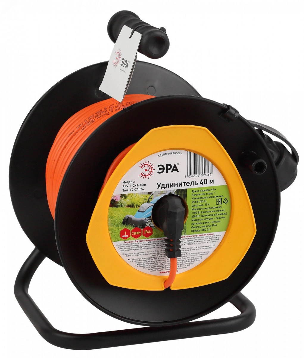 Удлинитель силовой на пластиковой катушке ЭРА RPx-1-2x1-40m без заземления, ПВС 2х1м2, 1 розетка, 40 м. Мощность 10А/2200Вт. Используется для работы на строительных площадках или дачных участках. Удобен при работе с приборами находящимися удаленно от стационарной розетки,. Например, газонокосилки, электрические, пилы, триммеры или электродрели. Провод в удлинителях Эра сделан из 100% меди, что делает его абсолютно пожаробезопасным. Рама удлинителя сделана из высокопрочной стали а пластиковой корпус выполнен с применением негорючих добавок.