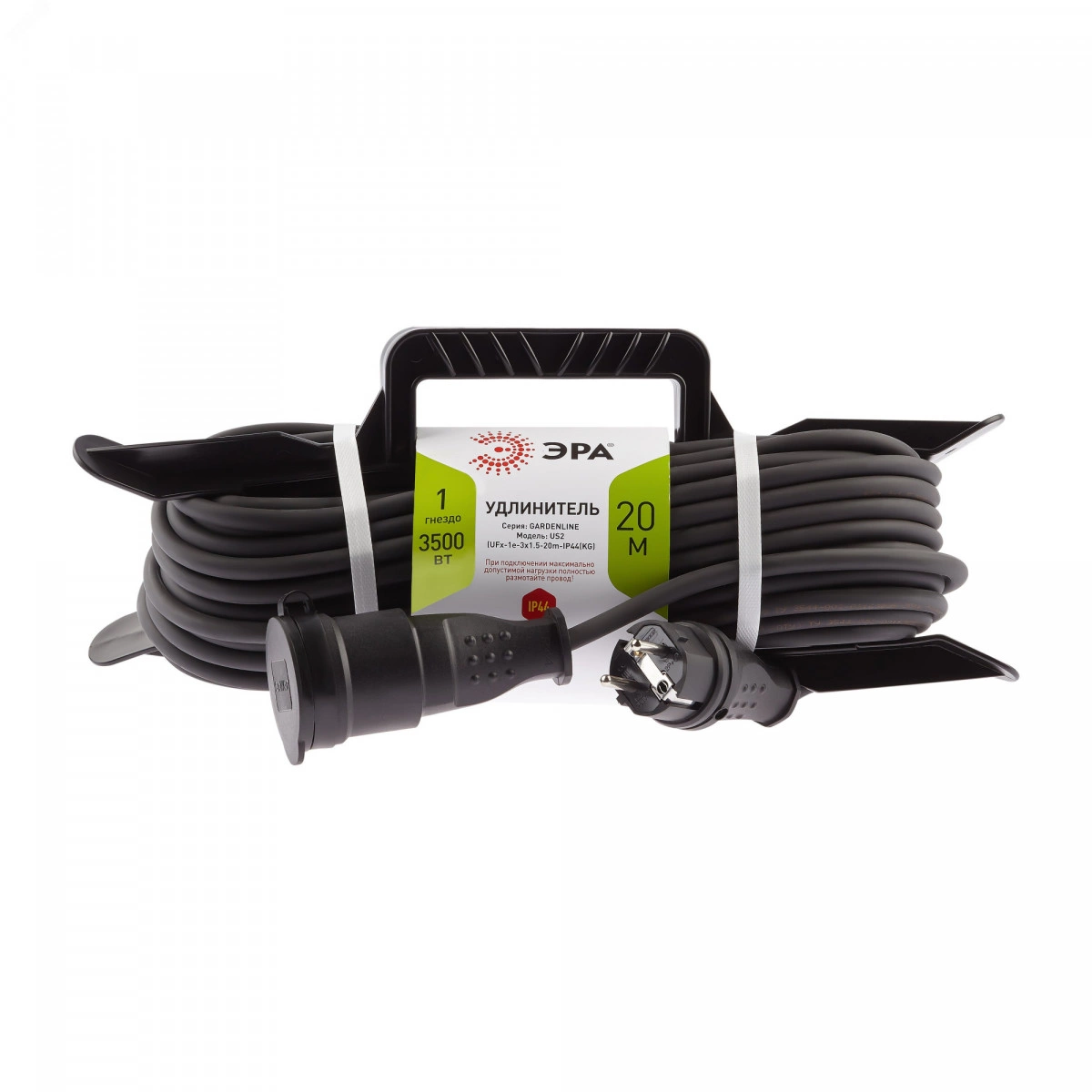 Удлинитель силовой на рамке ЭРА UFx-1e-3x1,5-20m-IP44(KG).  С одной влагозащищенной розеткой и проводом КГ с заземлением длиной 20 метров, сечением 3х1,5 мм2. Класс защиты IP44. Мощность 16А/3500Вт. Надежный, мощный удлинитель для любых работ. Характеристики провода КГ позволяют работать с удлинителем в широком диапазоне температур, что подойдет для любого времени года.