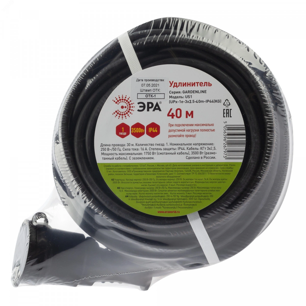 Удлинитель силовой в бухте ЭРА UPx-1e-3x2,5-40m-IP44(KG) с заземлением, КГ 3x2,5мм2, 1 розетка, 40м, степень защиты IP44. Мощность 16А/3500Вт. Используется для работы на строительных площадках или дачных участках. Удобен при работе с приборами, находящимися удаленно от стационарной розетки. Например, газонокосилки, электрические, пилы, триммеры или электродрели. Провод в удлинителях Эра сделан из 100% меди, что делает его абсолютно пожаробезопасным.