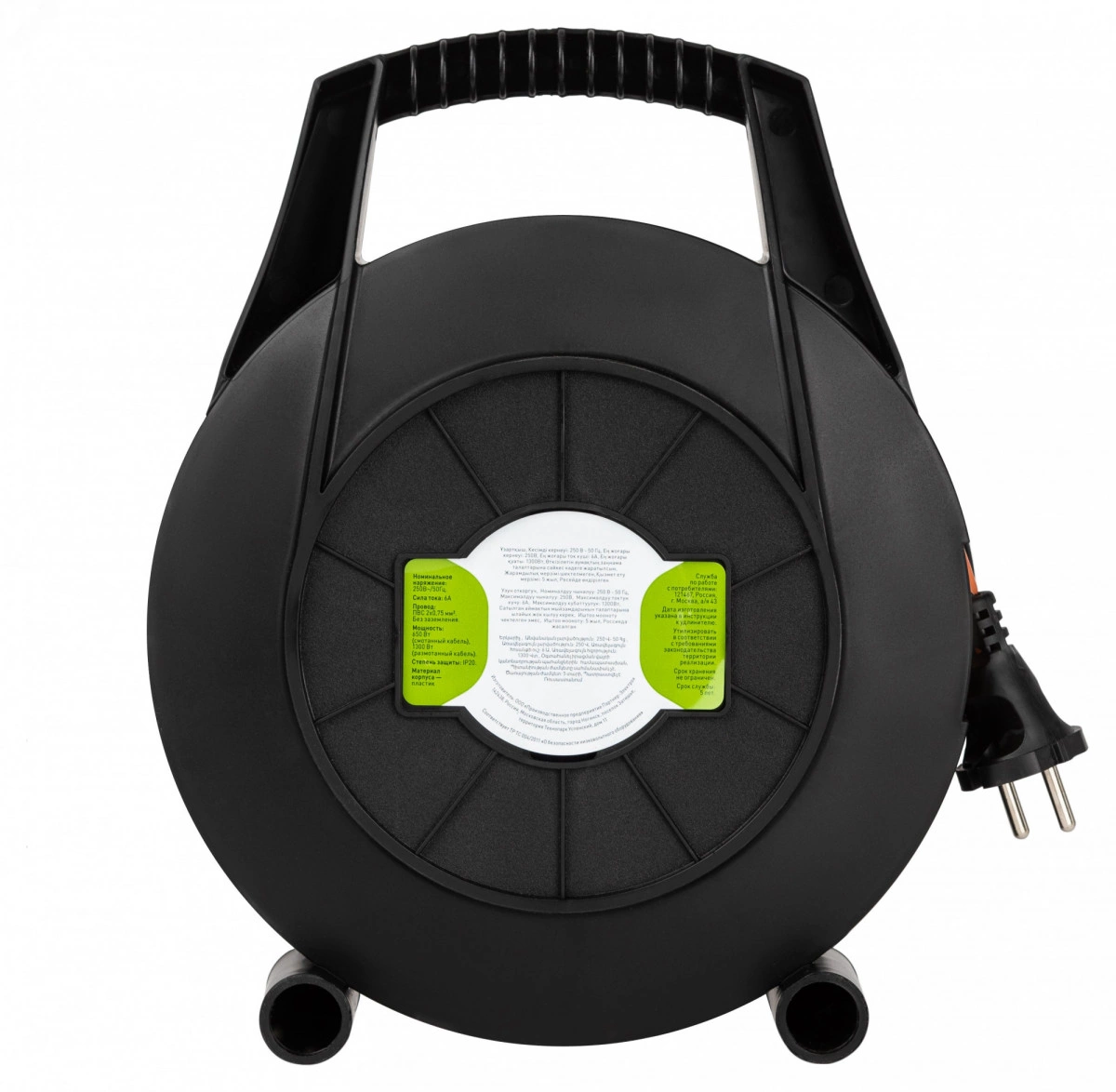 Силовой удлинитель в бухте. С одной влагозащищенной розеткой и проводом КГ с заземленем длиной 50 метров, сечением 3х2,5 мм2. Класс защиты IP44. Надежный, мощный удлинитель для любых работ. Характеристики провода КГ позволяют работать с удлинителем в широком диапазоне температур, что подойдет для любого времени года.