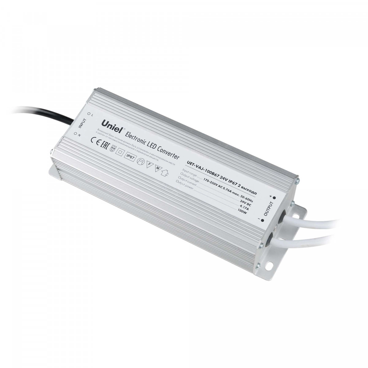 Полное описание: UET-VAJ-100B67 Блок питания для светодиодов с защитой от короткого замыкания и перегрузок, алюминиевый корпус, 100Вт, 24В, IP67, 2 выходных канала