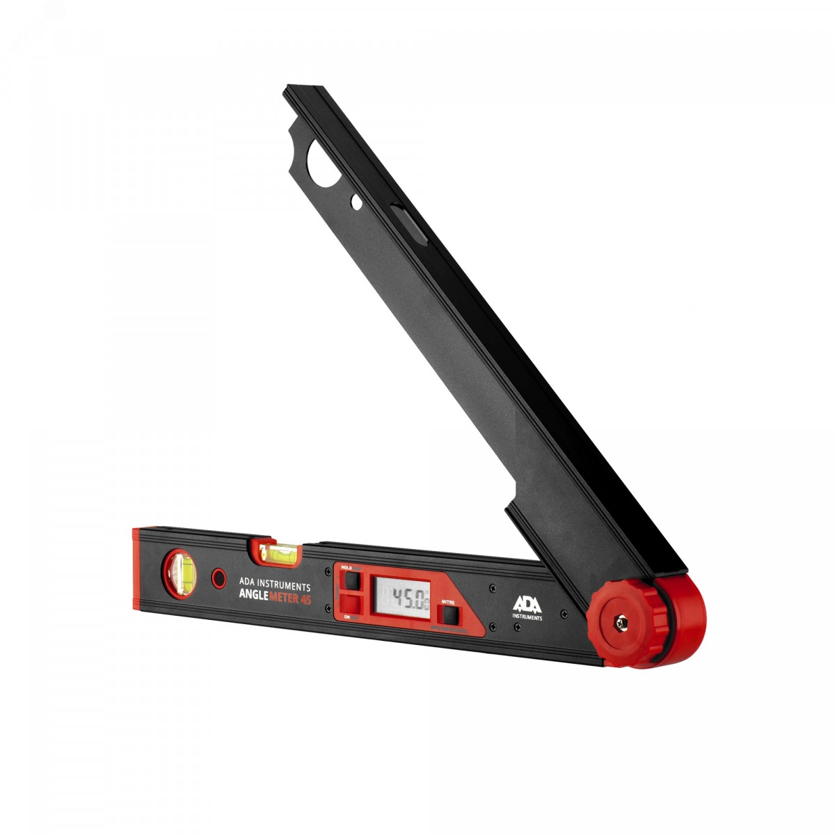 Электронный угломер ADA AngleMeter 45 - предназначен для измерений углов при плотницких и столярных работах. Корпус прибора целиком выполненный из анодированного алюминия. Массивный профиль с ребрами жесткости толщиной 2,5 мм не боится ударов и падений. Измеренные значения и режимы вычислений отображаются на ЖК дисплей. Точность ±0.1 градуса. Ориентируясь по цифрам на ЖК дисплее можно раскрыть угломер на требуемое значение угла и с помощью крепежного винта зафиксировать его. Приложив детали к плечам угломера останется только закрепить их положение. Для удобства работы есть режим 'HOLD' - удержания результатов на дисплее и подсветка. С калибровкой.