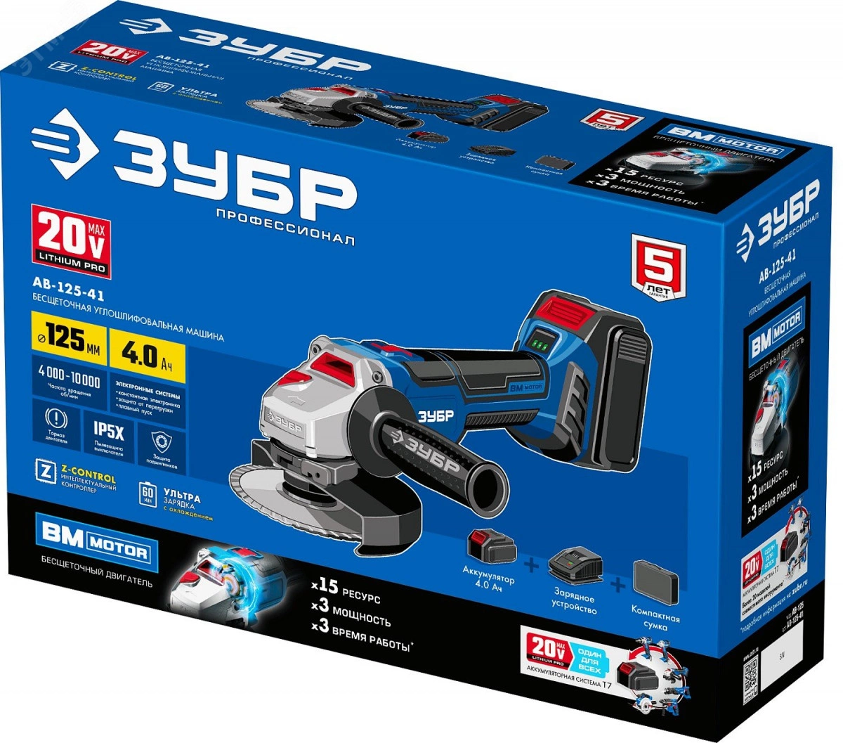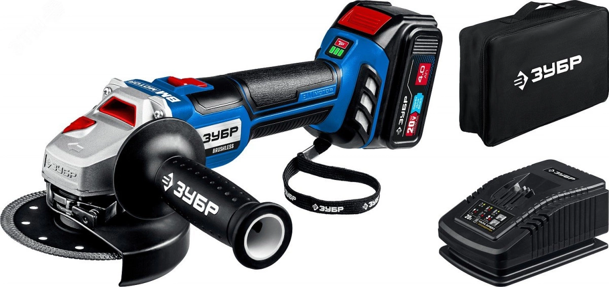 Угловая шлифовальная машина 20В бесщеточная, 1 АКБ (4Ач), в сумке, Профессионал