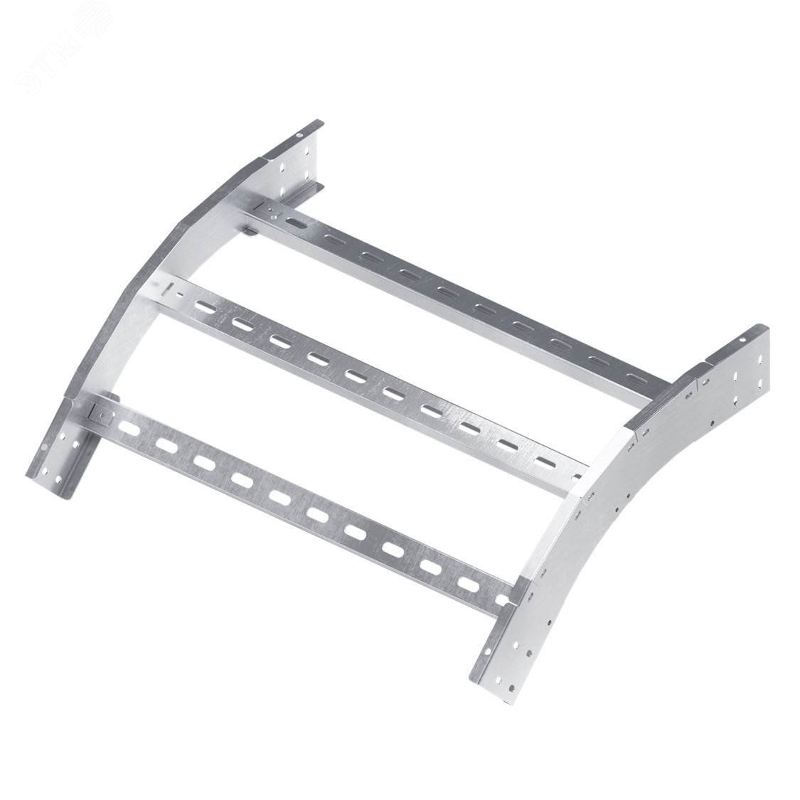 Угол вертикальный внешний предназначен для организации поворота трассы на основе лестничных лотков с высотой борта 100 мм и шириной основания 200 мм вниз на 45 градусов. Радиус поворота угла - 300 мм. Аксессуар поставляется в комплекте с крепежными элементами и соединительными пластинами, необходимыми для монтажа. Изделие представлено в специальном исполнении ‘Цинк-ламельное покрытие‘.