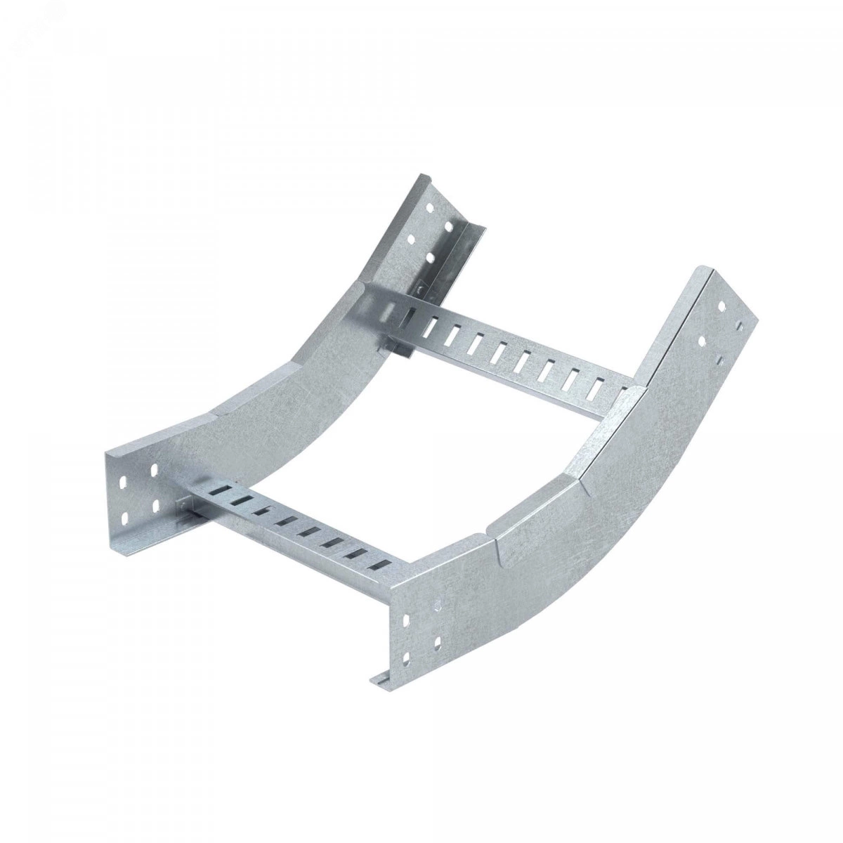 Угол вертикальный внутренний предназначен для организации поворота трассы на основе лестничных лотков с высотой борта 50 мм и шириной основания 500 мм вверх на 45 градусов. Радиус поворота угла - 300 мм. Аксессуар поставляется в комплекте с крепежными элементами и соединительными пластинами, необходимыми для монтажа. Изделие представлено в специальном исполнении ''Цинк-ламельное покрытие''. Толщина лонжерона изделия – 1,5 мм, а толщина поперечины – 1,0 мм.