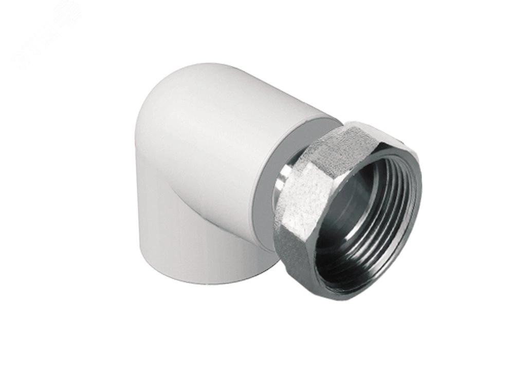 Двухсторонний полипропиленовый фитинг для соединения под углом 90 градусов друг к другу полипропиленового трубопровода и компонента инженерной системы с резьбовым подключением. Монтаж осуществляется с помощью накидной гайки.