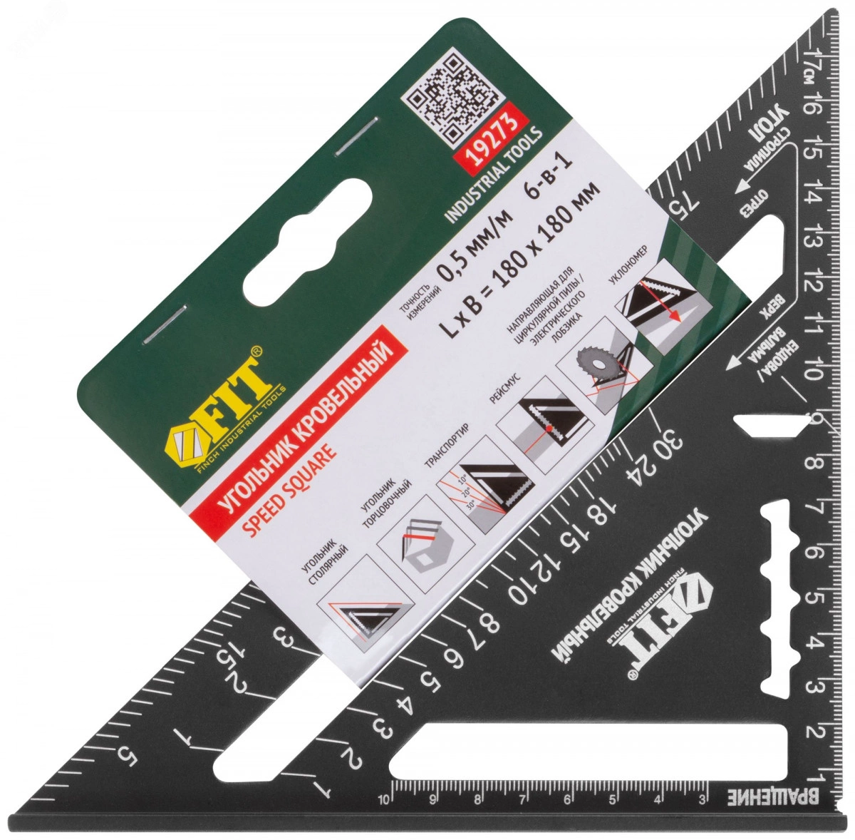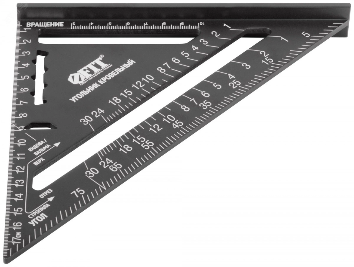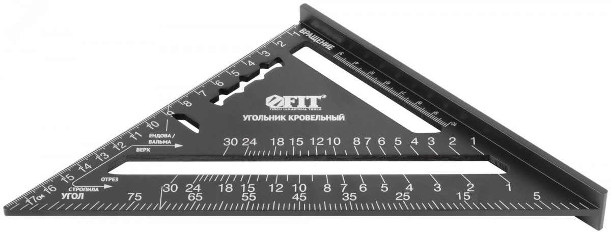 Угольник кровельный FIT IT может применяться как угольник столярный, угольник торцовочный (для разметки стропил кровли), транспортир, рейсмус (для создания линий, параллельных краю доски), направляющая для циркулярной пилы / электрического лобзика, уклономер (в случае применения со строительным отвесом). Толщина корпуса составляет 4,5 мм и обеспечивает высокую прочность. Разметка с метрической шкалой изготовлена методом высокоточной лазерной гравировки и обладает высокой износостойкостью. Фрезеровка угольников обеспечивает высокую точность — 0,5 мм/м. Угольник имеет базовые разметочные углы 45 градусов и 90 градусов с целью быстрой разметки или проверки углов на изделиях.