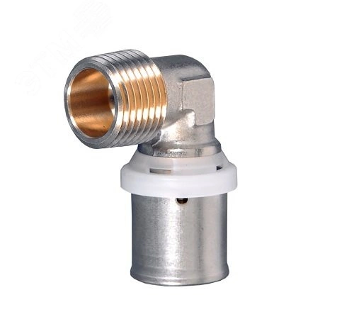 Пресс-фитинг угольник с переходом на наружную резьбу MV предназначен для подключения к металлопластиковым трубопроводам элемента с внутренней резьбой. Корпус фитинга выполнен из латуни марки CW617N, уплотнительные кольца – из EPDM, пресс-гильзы – из нержавеющей стали. Для монтажа применяется пресс-инструмент с насадками типа 'ТН'