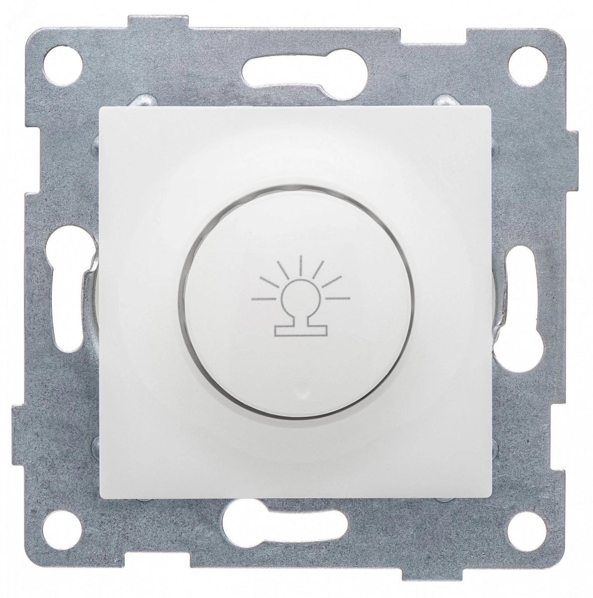 Механизм диммера предназначен для коммутации и регулирования яркости ламп накаливания и галогеновых ламп. При повороте ручки регулятора происходит регулирование, в крайнем левом положении выключение. Устанавливается в монтажные коробки или специальные монтажные полости при скрытой проводке электрических сетей. Диммер позволяет производить монтаж, как при помощи распорных лапок, так и на резьбовые элементы в монтажной коробке.