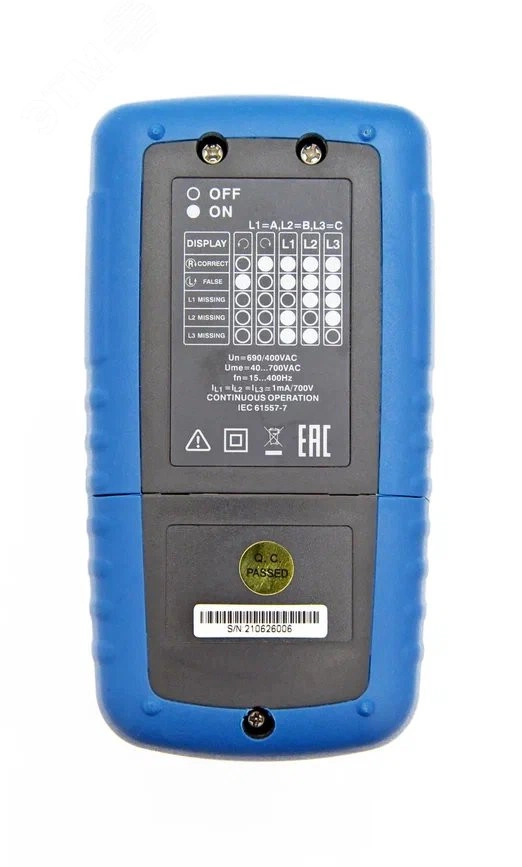 Индикатор порядка чередования фаз DT-901 производителя СЕМ предназначен для обнаружения сложных электрических трехфазных систем. При готовности работы прибора загорается зеленый свет индикатора. Порядок следования фаз отображается на дисплее. В случае прямого следования фаз индикатор вращения поворачивается по часовой стрелке, в случае обратного - против. Корпус модели соответствует типу защиты IP40 и успешно препятствует попаданию пыли и влаги на внутренние элементы системы. Для работы индикатора не требуется батарея - питание осуществляется непосредственно от испытываемой установки.
