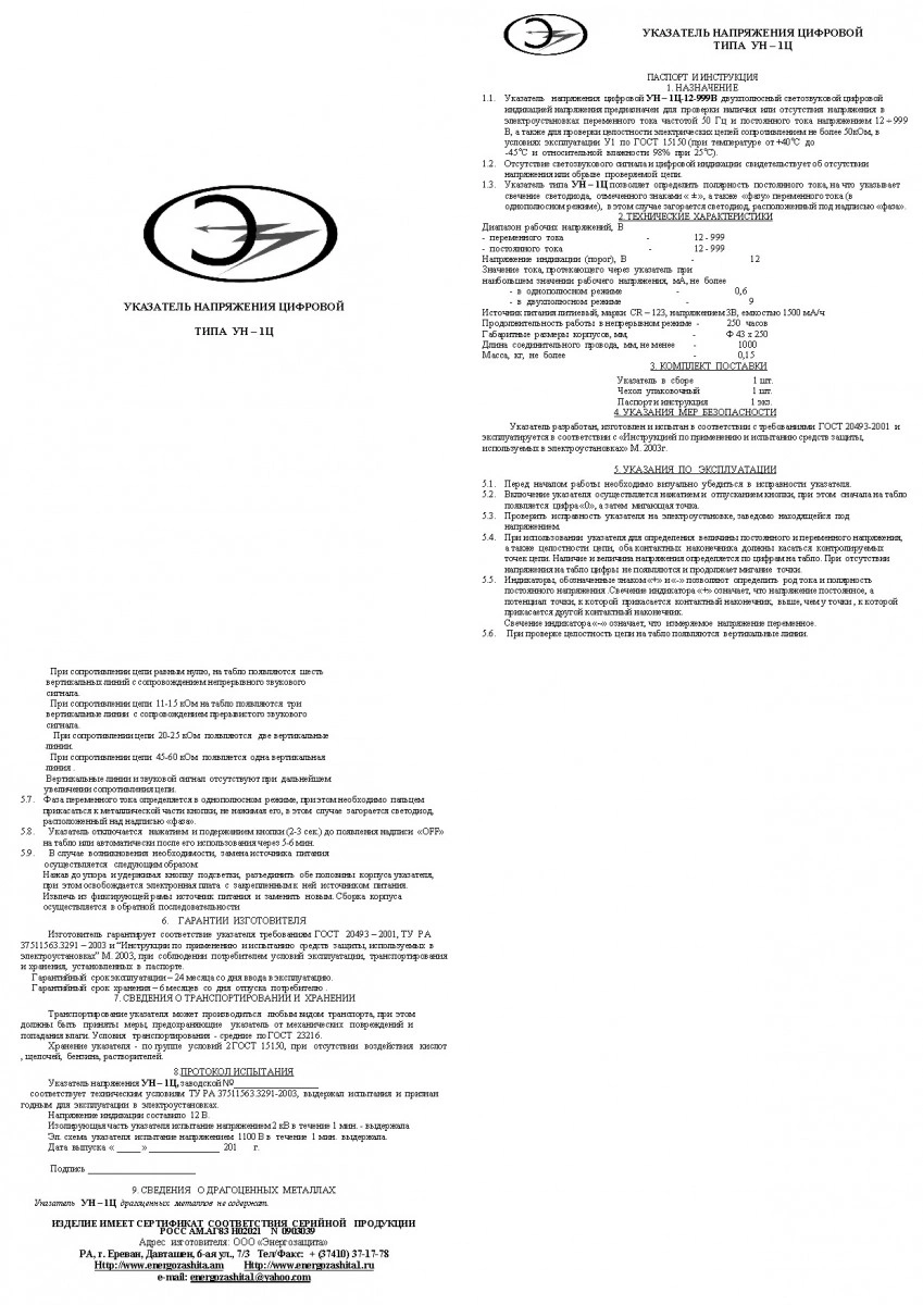 Указатель напряжения цифровой УН–1Ц-12-999В двухполюсный светозвуковой цифровой индикацией напряжения предназначен для проверки наличия или отсутствия напряжения в электроустановках переменного тока частотой 50 Гц и постоянного тока напряжением 12, 999 В