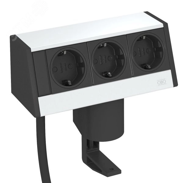 Настольный бокс с соединительным кабелем, кабельный вывод с нижней стороны, с крепежным зажимом для фиксации на столешнице толщиной от 8 до 40 мм. Комплектация: - с 3 розетками 0° с защитным контактом, черного цвета, с сетевым кабелем 3,0 м с угловым штекером CEE 7/7.