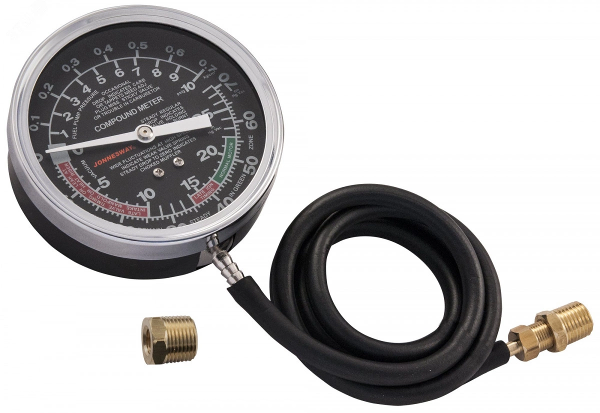 Прибор, позволяющий определять работоспособность двигателя автомобиля, производя измерения разряжения впускного тракта, что проверяет работу клапанов ГРМ. Производить измерение разряжения вакуумного усилителя привода тормозов, измерения разряжения топливной магистрали (карбюратор). Измерение давления топливного насоса (карбюратор). Прибор снабжен 64 мм циферблатом, градуированным до 1 кгс/смкв., длинным шлангом с коническим наконечником для подключения к вакуумным и топливным магистралям. Инструмент запрещается использовать для измерения давления топливных магистралей двигателей с электрическими топливными насосами.