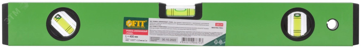 Уровень ''Техно'', 3 глазка, зеленый корпус, фрезерованная рабочая грань, шкала 400 мм